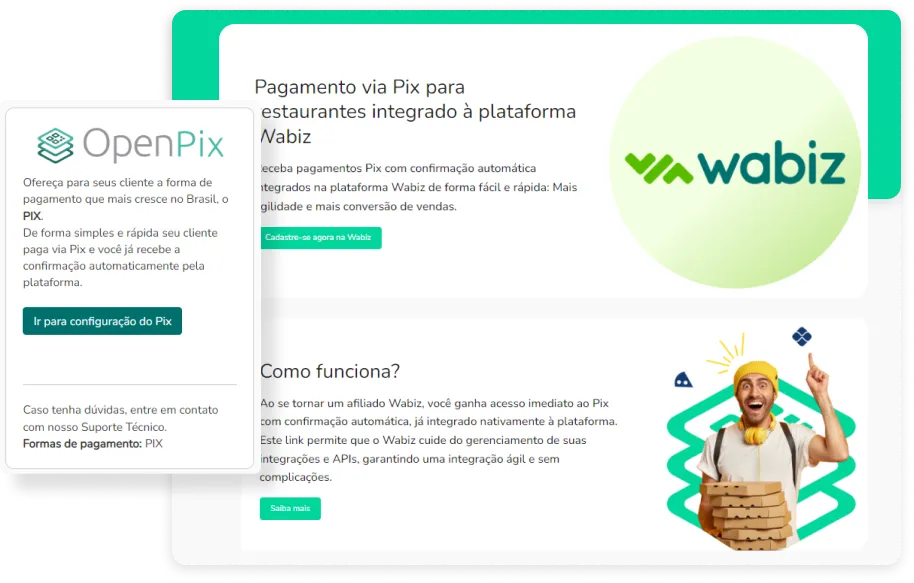 A OpenPix oferece uma integração rápida e eficiente para o seu restaurante, pizzaria ou serviço de delivery.